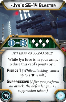 So as any one in the inner circle of play for the garrison knows. This is my Party Jyn list (As in Party Bus + Jyn). I put Jyn in the landspeeder and pump aims into her, the landspeeder, the bus and/or the wookiees. With Jyn's SE-14 Blaster Jyn is able to get about two aims and punch through a big surge to crit sharpshooter 1 suppressive shot. On her one pip turn she can shoot twice at someone (often before they rally) pushing 4 suppression onto a unit with just her that round.